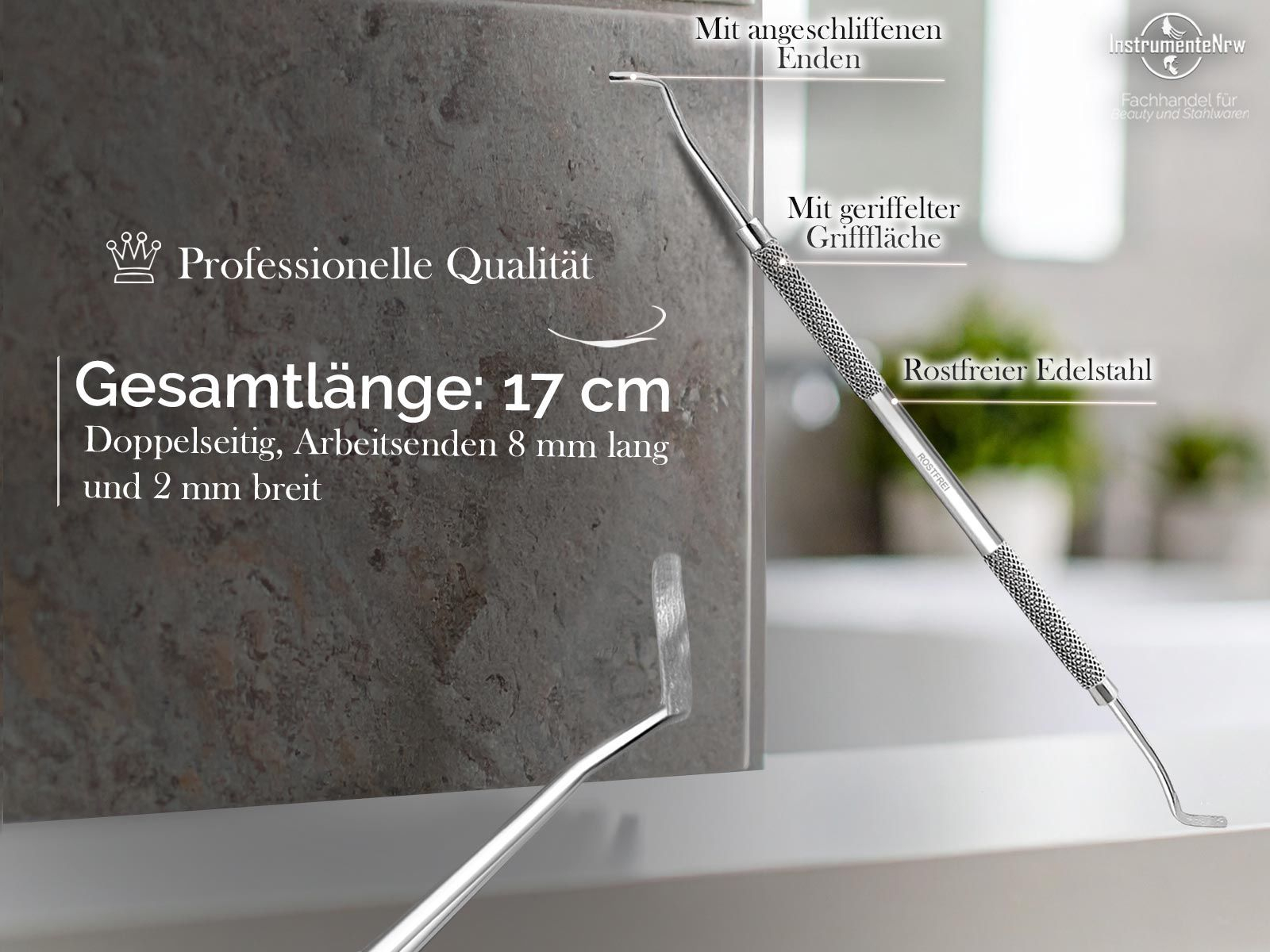 Eckenheber (Doppelinstrument) mit mittleren Enden Professionelle Qualität die hergestellt wird, Für Links- und Rechtshänder Gesamtlänge: 17,0 cm Länge der Enden: 0,8 cm Material: rostfreier Edelstahl Der Eckenheber eignet sich hervorragend für Nagelecken An der Grifffläche befindet sich eine Riffelung die ein Abrutschen verhindert und somit ein sicheres Arbeiten ermöglicht