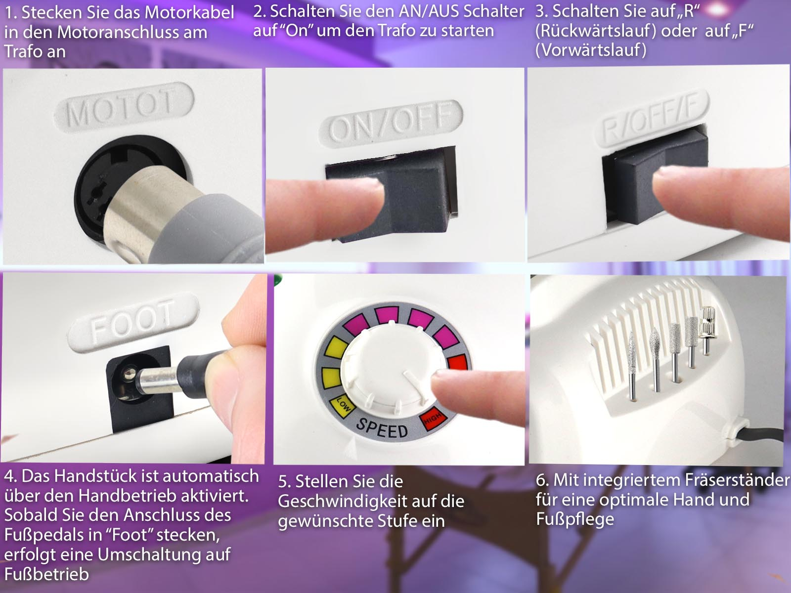 - 1 Motor, 1 Handstück, 1 Fußpedal, 12-Teiliges Schleifer Set, 5-Teiliges Profi Set für die Fußpflege