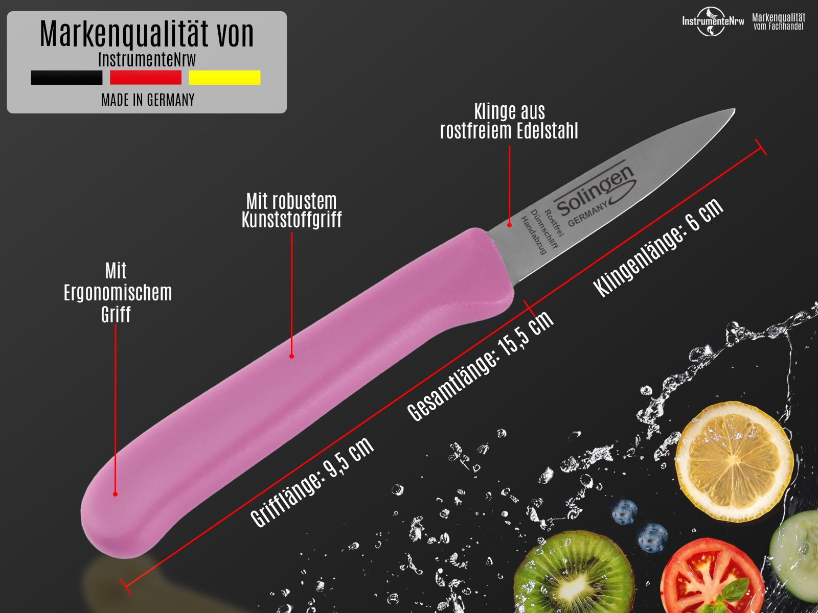 Die Gesamtlänge der Obstmesser sind ca. 17,5 cm. Die Länge der Messerklinge ist ca. 7,5 cm. Der Ergonomisch geformte Griff ist ein Klassischer Kunststoffgriff. Dieser ist mit einer Anti-Rutsch Beschichtung für ein besseres Handling beim Schneiden. Die Schneidemesser sind sowohl für Rechtshänder als auch für Linkshänder geeignet. Solinger Qualitätsprodukt.