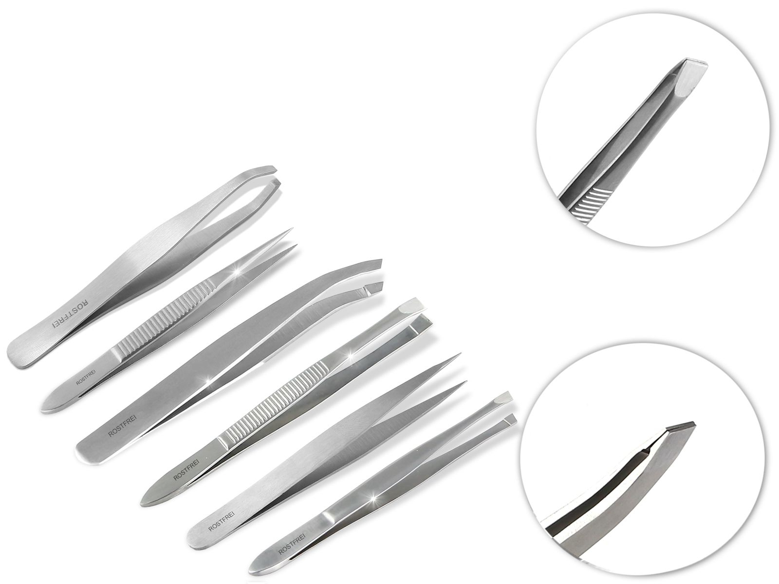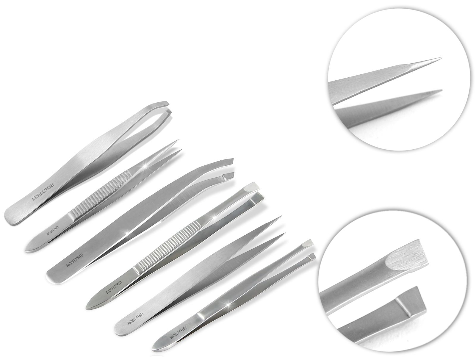 - Bestehend aus folgenden Pinzetten: 2x Schräg, 2x Spitz, 2x Gerade