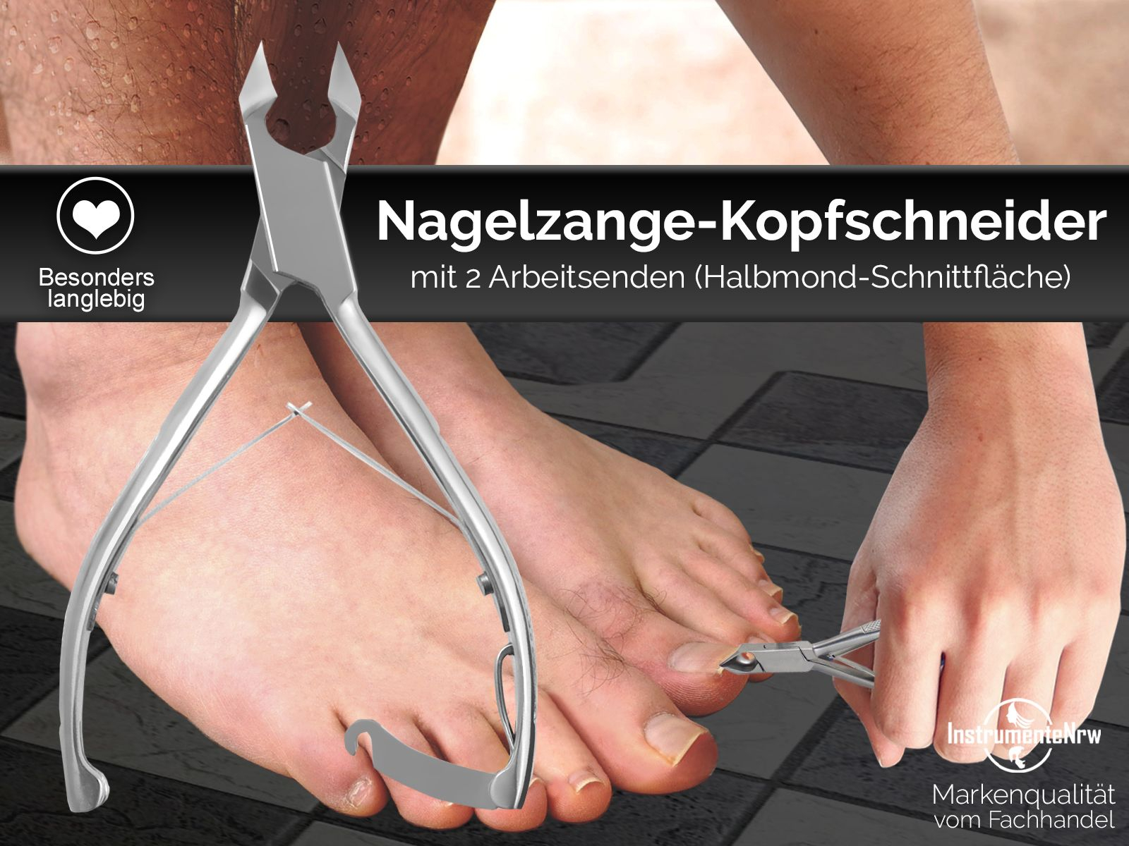 Die Nagelzange verfügt über eine spitze, gebogene Schnittfläche. Mit geschraubter Doppelfeder. Für die Sicherheit beim Transport ist im unteren Schenkel eine Sperre eingebaut Premium Nagelzange zum Kürzen von Fuß- und Fingernägel. Die Gesamtlänge beträgt 14 cm. Die gebogene Schnittfläche beträgt 17 mm. Qualität von NAIL-PERFERCTION by InstrumenteNRW mit Frimensitz in Deutschland. Kopfschneider sind Kombinationszangen aus einer Eckenzange und einer Nagelzange. Kopfschneider sind ALLROUNDER für normale bis kräftige Nägel geeignet. Durch seine schlanke Form liegt er gut in der Hand. Die Schnittfläche ist der Ergonomie des Zehennagels nachempfunden. Rostfreies gehärtetes Edelstahl - Stabile Ausführung. Für Rechts und Linkshänder geeignet.