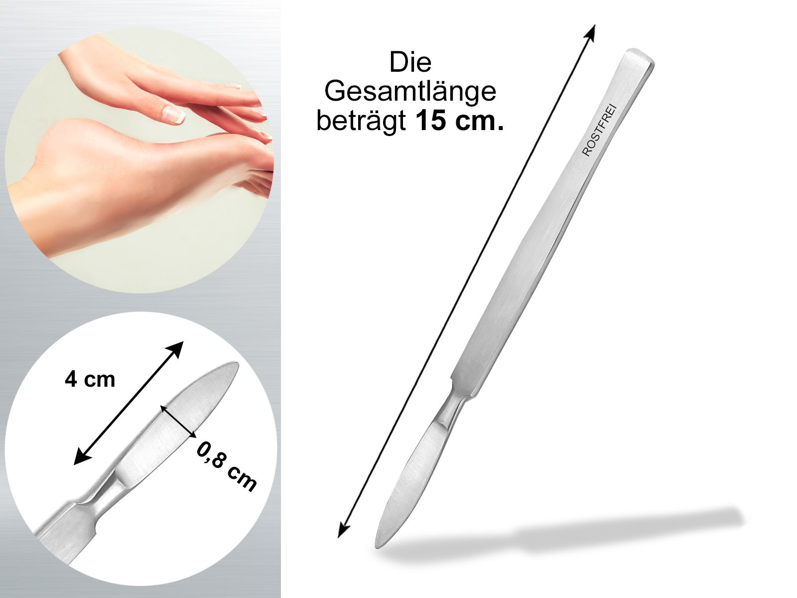 Stumpfer Hornhautschaber Creme-Spatel für die Fußpflege zur Entfernung von Hornhaut. Die Gesamtgröße beträgt 15 cm. Die Stumpfe Abzug Kante hat eine Länge von 4 cm. Hergestellt aus rostfreiem Edelstahl. Bestens geeignet für Links- und Rechtshänder.