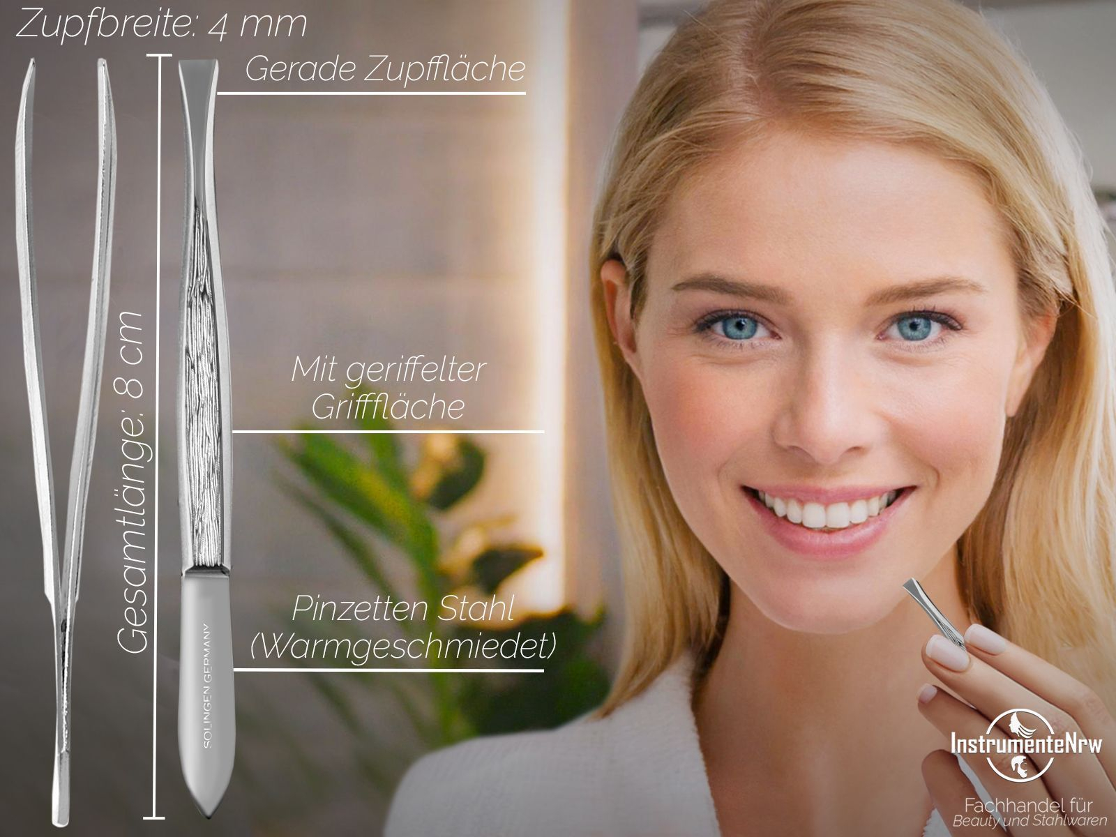 Die Gesamtlänge der Pinzette ist 8 cm. Die Zupffläche ist Gerade und beträgt ca. 4 mm. Perfekt aufliegende Spitzen. Die Haarpinzette wurde aus warmgeschiedetem Pinzettenstahl hergestellt. Dank der speziellen Fertigung ist diese Pinzette sehr stabil und langlebig.