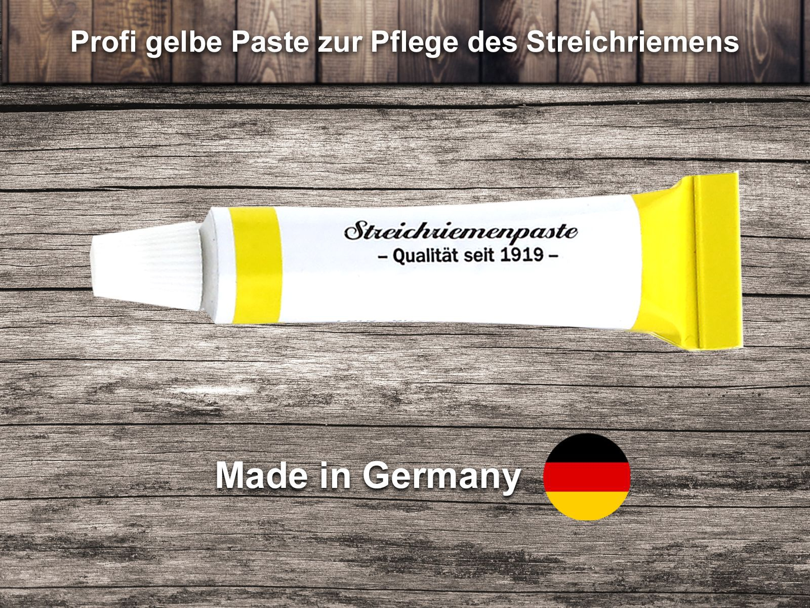 - Feine Schleifpaste zur Unterstützung des Schärf-Vorganges und Pflege des Leder Streichriemens
