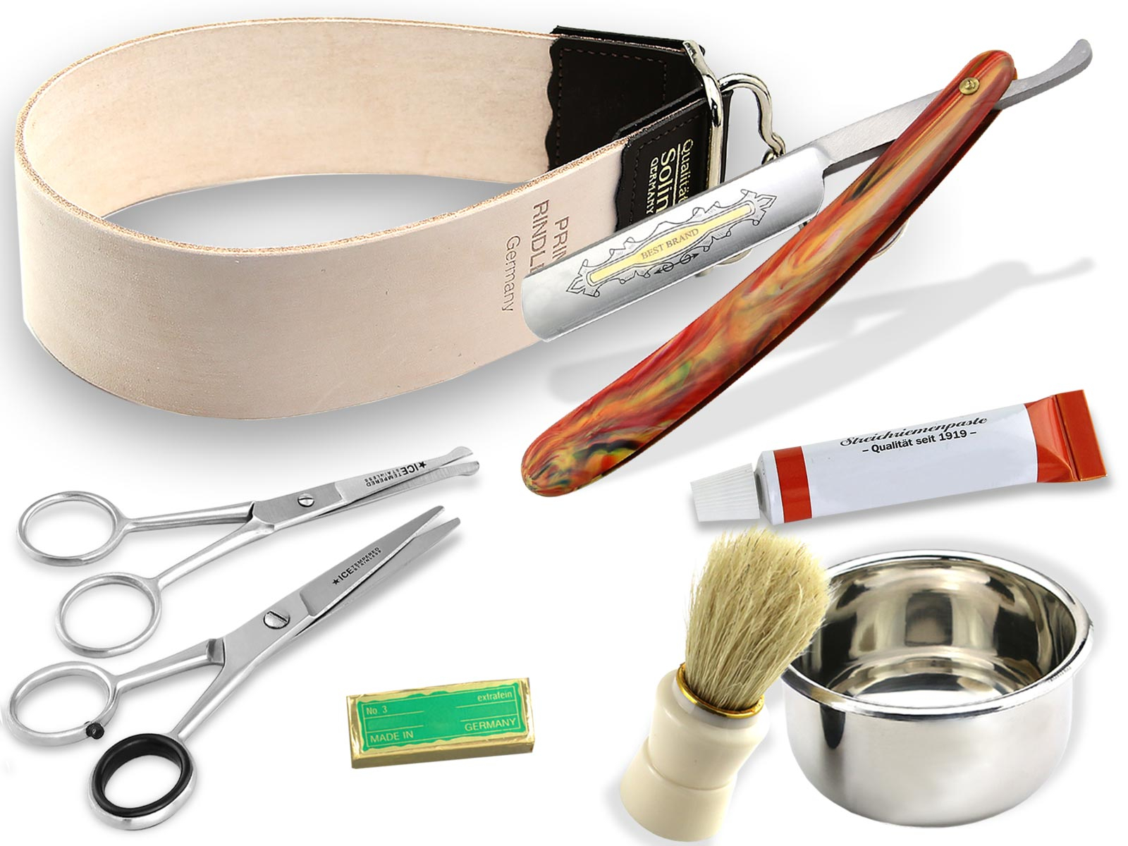 Lieferumfang: 1 x Rasiermesser, 1 x Streichriemen, 1 x Rasierpinsel, 1 x Rasierschale, 2 x Paste, 1 x Bartschere, 1 x Nasenhaarschere