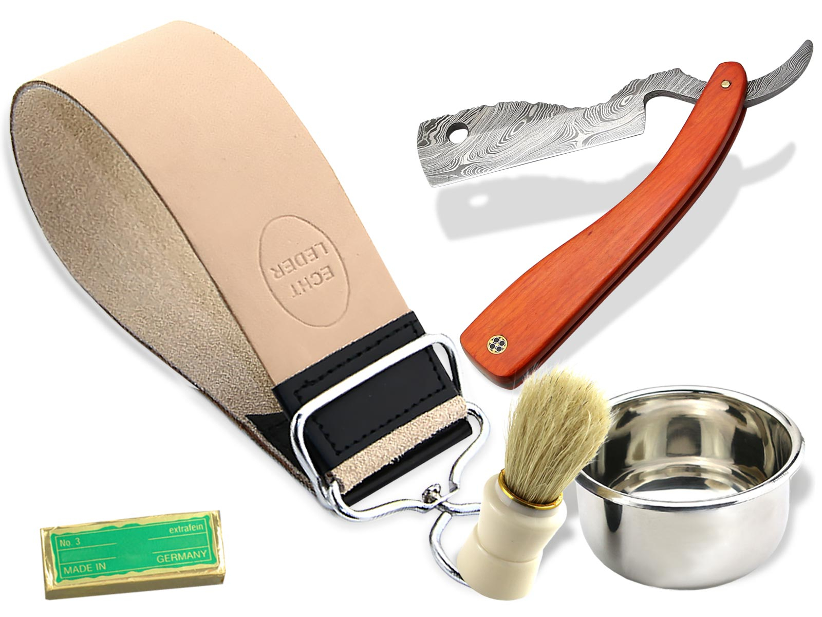 Damast Rasiermesser-Set mit Leder-Streichriemen, Rasierpinsel, Rasierschale und Schleifpaste von Puma mit Sitz in Solingen