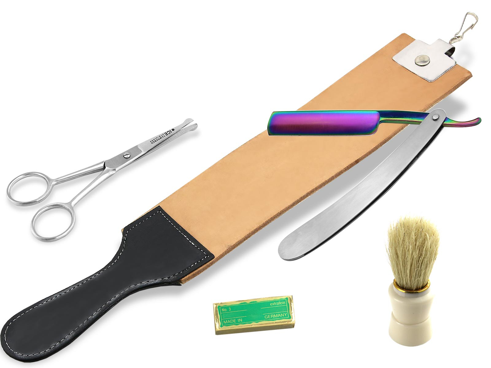 - Lieferumfang: 1 x Rasiermesser, 1 x Paste, 1 x Streichriemen, 1 x Rasierpinsel, 1 x Nasenhaarschere