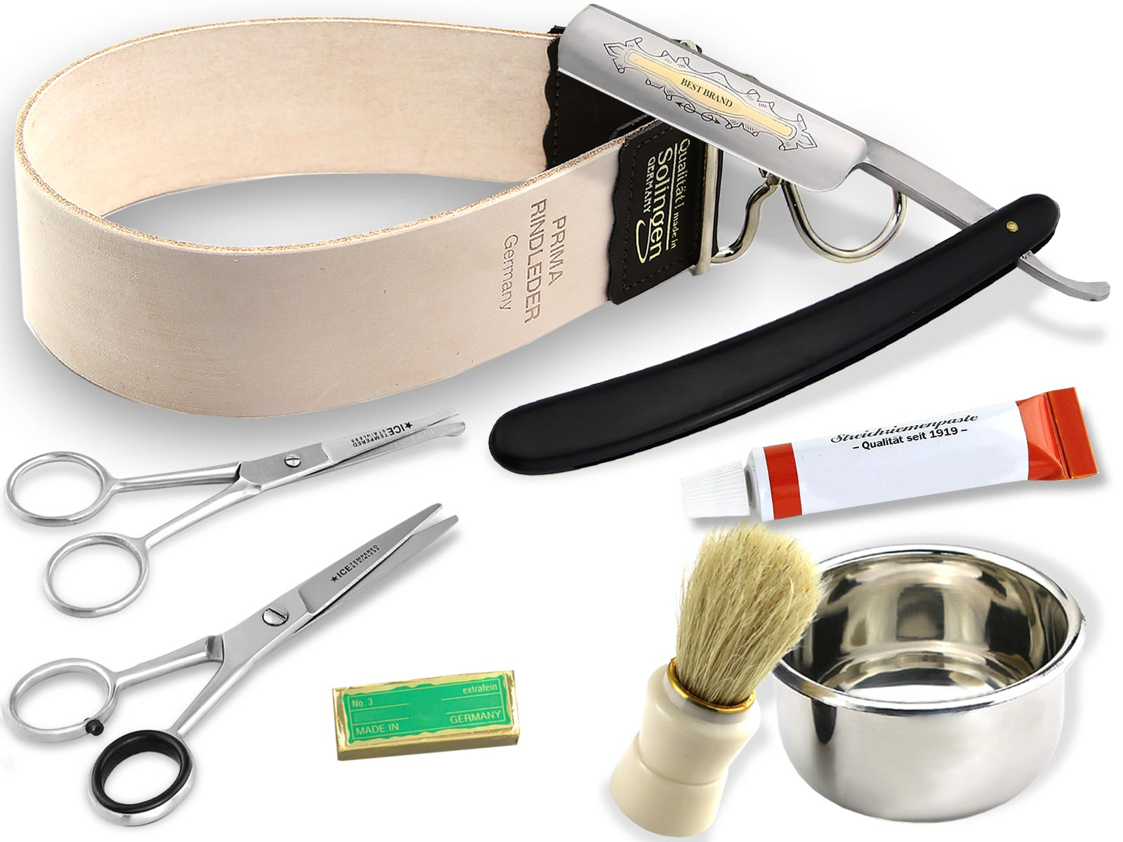 - Lieferumfang: 1 x Rasiermesser, 1 x Streichriemen, 1 x Rasierpinsel, 1 x Rasierschale, 2 x Paste, 1 x Bartschere, 1 x Nasenhaarschere