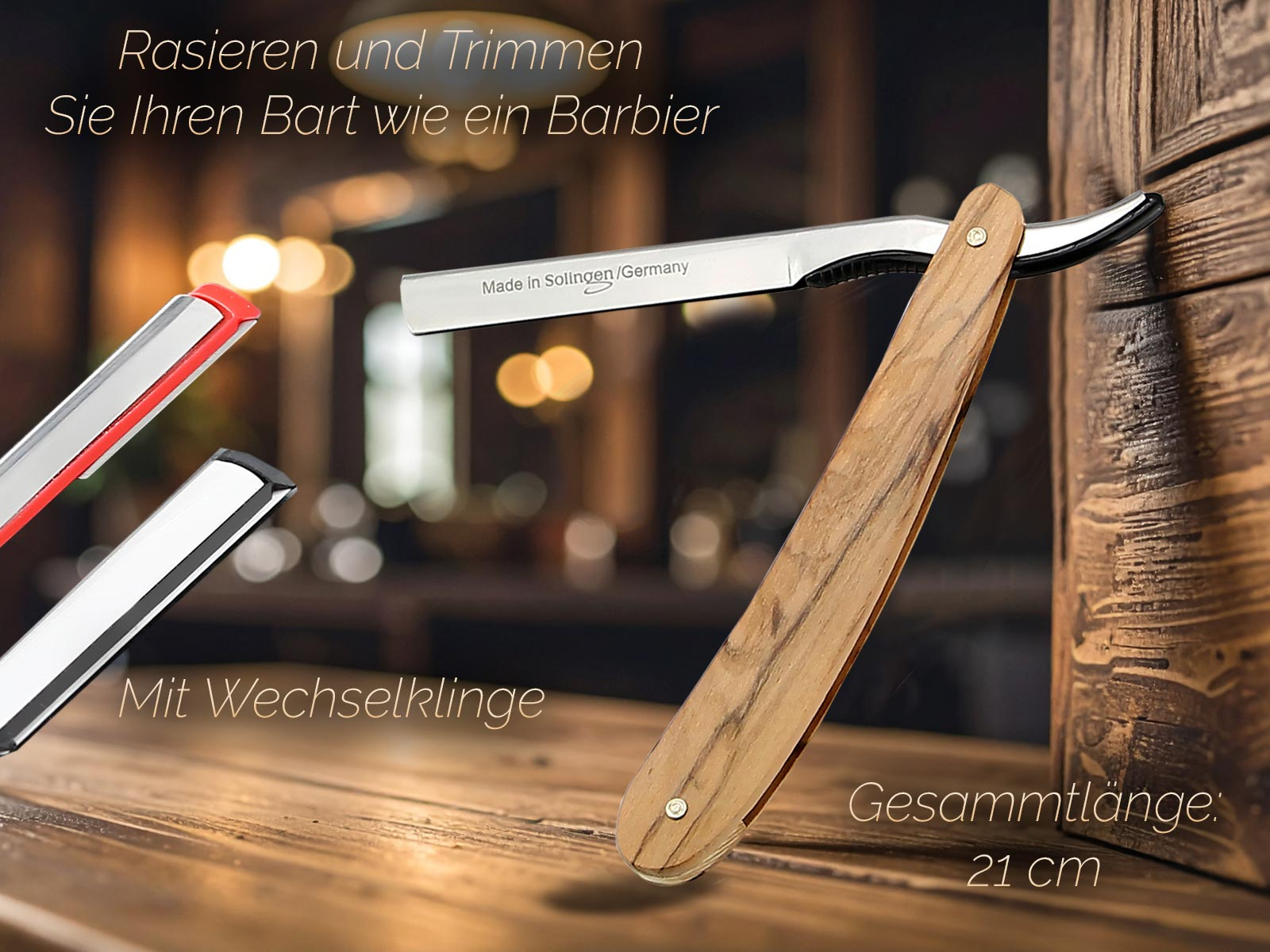 Rasiermesser mit Wechselklingen aus Solingen mit Kleiner und Großer Wechselklinge für die perfekte Nassrasur. Made in Germany. Das Schnurrbart Messer bietet Ihnen die Möglichkeit Ihren Bart perfekt zu pflegen, durch die zwei verscheiden Wechselklingen können Sie Ihren Vollbart rasieren, wie ein Profi. Die beiden Klingen haben eine Länge von ca. 6,5 cm und 3,5 cm. Im Rasier-Set erhalten Sie 2 verschiedene Klingenhalter, einmal einen Roten (Kleine Klinge) und einen schwarzen (Große Klinge) Der Olivenholz Griff (Heft) des Barbier Rasier Messers hat eine Länge von ca. 12 cm. Ergonomisch geformt und ein perfektes Handling.