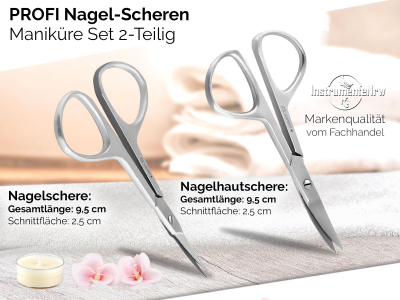 1 x Nagelschere: Länge 9,5 cm, gebogene Schnittfläche, Länge der Schnittfläche: 2,5 cm 1 x Hautschere: Länge 9,5 cm, gebogene Schnittfläche, Länge der Schnittfläche: 2,5 cm. Qualität von ICE-NAIL-Perfection by InstrumenteNRW mit Frimensitz in Deutschland. Die Profi Nagelschere verfügt über eine Stellschraube zum Nachstellen. Die Oberfläche ist matt, somit wird ein blendfreies Arbeiten gewährleistet Nagelschere + Nagel-Hautschere mit "Schmetterlingsgriff". Wurden aus rostfrei Eis-gehärtetem Edelstahl hergestellt. Geeignet für normale bis mittelstarke Finger- und Fuß-Nägel. Professionelle Ausführung. Die präzise Fertigung sorgt für eine langlebige und präzise Leistung.