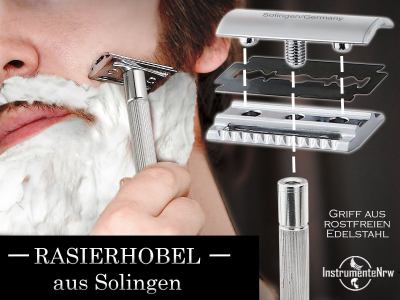 Rasierhobel aus Solingen mit Edelstahl Griff. Made in Germany. Die Länge des Nassrasierers beträgt 9,5 cm. Es können klassische Rasierklingen verwendet werden. Safety Rasierer mit Geschlossenem Kamm für mehr Sicherheit bei der Rasur. Der Hobel zur Rasur ist perfekt ausbalanciert, lassen Sie ihn einfach gleiten ohne viel Druck auszuüben. Professionelle Ausführung, Solinger Qualitätsprodukt.